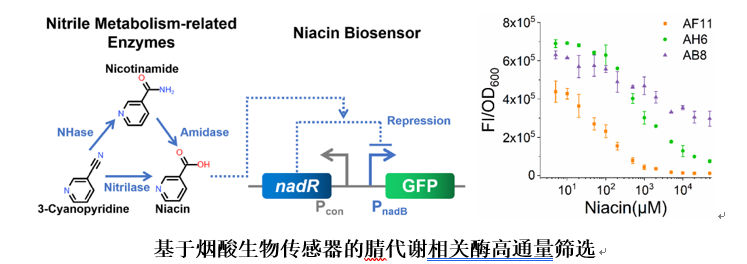 基于改造后的NAsensor,研究者设计和构建了腈水解酶和酰胺酶的体内高通量筛选平台。利用CAST策略构建腈水解酶和酰胺酶的随机组合突变体库,筛选获得高活性突变体。在此基础上,研究者又拓展NAsensor用于筛选腈水合酶,在NAsensor中引入了烟酰胺转化模块,使得腈水合酶催化烟腈的产物烟酰胺能够被迅速转化为烟酸,进而被NAsensor检测。利用拓展的NAsensor,实现了热稳定腈水合酶的高活性进化。值得注意的是,通过该平台筛选到的高活性突变体,不仅仅催化烟腈/烟酰胺的活性大幅提升,对结构类似的其他芳香族底物的活性同样提升明显。本研究成果说明基于抑制型的生物转录因子更适合梯度筛选的生物传感器构建,同时也将大力促进腈类化合物转化产物的生物制备。