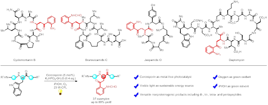 犬尿氨酸(L-kynurenine, Kyn)是一种重要的色氨酸代谢物,本身具有神经保护作用和免疫抑制活性,并且广泛存在于天然多肽产物中,如具有抗炎活性的cyclomontanin B,具有抗增殖作用的Jaspamide O,具有潜在的抗结核活性的Brunsvicamide C,以及FDA批准的具有抗生素活性的皮肤感染药物Daptomycin(图1)。由于Kyn残基自身的较大位阻和低偶联活性,导致其直接通过传统的肽键缩合法引入多肽较为困难,所以含有色氨酸多肽的选择性氧化法被广泛使用于含犬尿氨酸多肽的合成中。但是目前的方法需要在苛刻的低温条件(-78oC)下使用毒性较大的强氧化剂臭氧,或使用易燃易爆的过氧化物及易造成环境污染的重金属催化剂,均不符合绿色化学的理念。因此,伴随着全球对环境保护日益增长的重视,开发一种绿色、高效、简便的含Kyn多肽的合成方法是非常必要的。