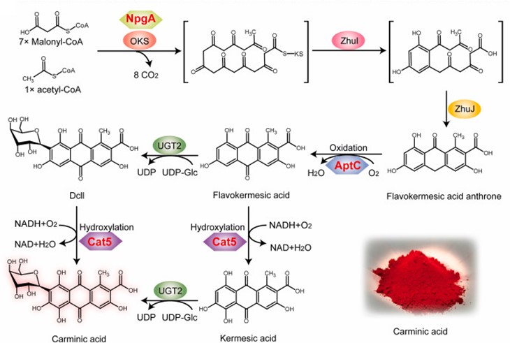 胭脂红酸是一种糖基化蒽醌类化合物。作为一种红色着色剂,具有耐热、耐光、抗氧化、无致癌性以及对人体皮肤接触无毒害等特性,被广泛应用于食品、日化、制药、纺织等领域。目前,胭脂红酸主要通过从雌性胭脂虫干体中提取的方法获得,该方法具有生产周期长、生产效率低,来源受限,且成本高等缺点。微生物生产胭脂红酸可以避免这些缺点,并可能成为其可持续供应的潜在替代途径。