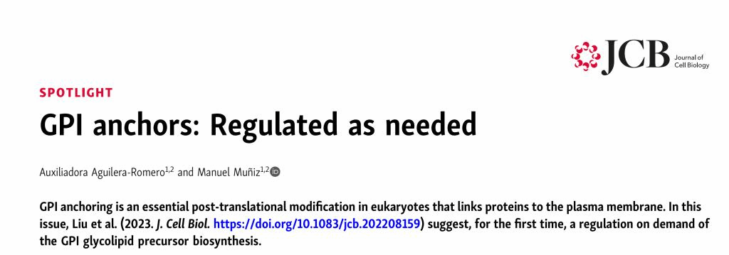 近日,西班牙塞维利亚大学(University of Seville)Manuel Muñiz教授及Auxiliadora Aguilera-Romero博士在国际高水平期刊Journal of cell biology上撰文(//rupress.org/jcb/article/222/5/e202303097/214027/GPI-anchors-Regulated-as-neededGPI-anchors),专题报道我院青年教师柳艺石近期发表的GPI锚定蛋白相关研究工作(Liu et all,. J Cell Biol. 2023; 222(5): e202208159. //doi.org/10.1083/jcb.202208159)。