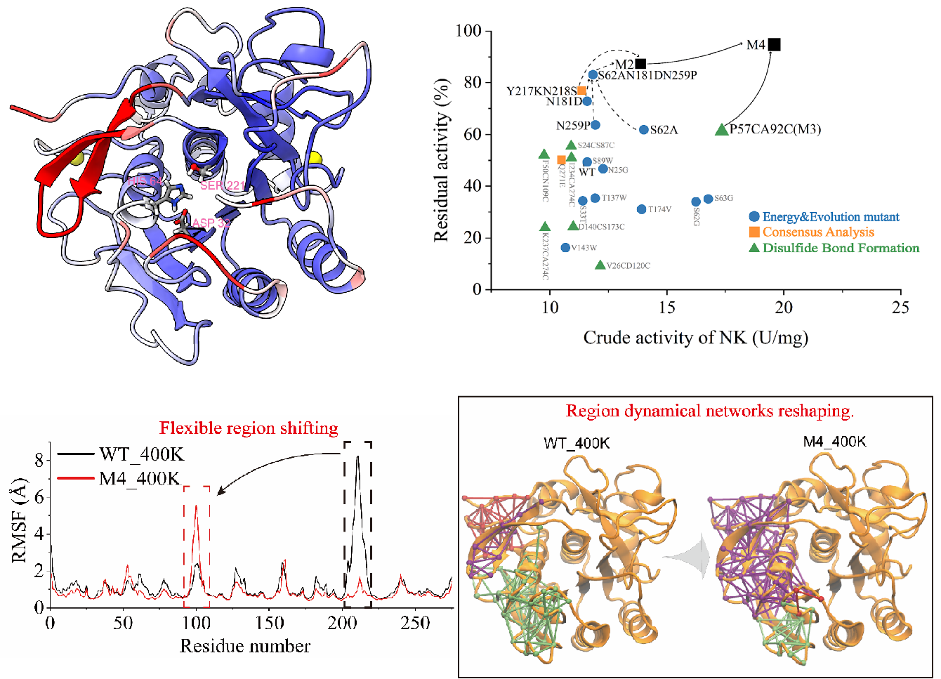 针对这一问题,该研究首先采用常规分子动力学模拟对野生型纳豆激酶在300K与400K条件下分别进行了动力学模拟。结果显示,纳豆激酶较多的Loop结构是其主要的热敏感区。针对热敏感区,进行了包含折叠自由能预测设计、二硫键设计和序列共识设计的多策略改造。经迭代优化,最终获得组合突变M4,其在55℃下半衰期较野生型提升了20.7倍,同时比酶活也较野生型提升2倍。经的RMSF、Rg、DCCM分析,以及元动力学模拟(Metadynamics MD)发现:M4的结构的整体柔性与野生型无明显差别,但其局部柔性区发生转移。进一步的动力学网络分析显示:该柔性区转移是由残基间动力学网络的重构驱动的。以上研究不仅获得了一个高性能纳豆激酶突变体,更重要的是,消除“活性-热稳定性Trade-off”新机制的发现对于其他高性能酶的设计与改造提供了借鉴与指导。