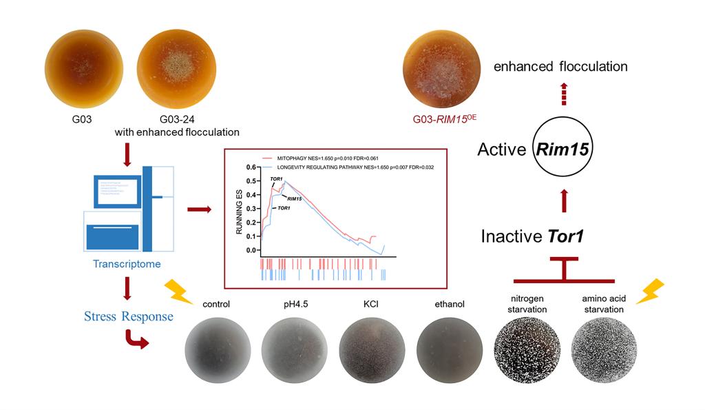 李崎教授团队在该研究中,对一株工业拉格啤酒酵母G03及其絮凝增强突变菌株G03-24进行了转录组比较分析,从GO和KEGG分析富集到与胁迫刺激相关的差异基因和通路。在发酵过程中,可发酵的碳源、氮源等营养物质会被迅速利用,乙醇浓度增加,有机酸分泌,二氧化碳产生,发酵液的PH下降,渗透压增加,尤其到了发酵中后期,酵母细胞受到的环境压力将越来越大。为了探究发酵过程中影响酵母絮凝性的关键胁迫因素,分别模拟酵母细胞在发酵过程中遇到的胁迫因素,观察絮凝情况。该研究发现在氮饥饿和氨基酸饥饿条件下,在絮凝显示缓冲液中的酵母细胞出现了明显的絮凝现象,且F值和Lg-FLO1基因表达水平均较高,差异显著,说明氮饥饿和氨基酸饥饿是影响絮凝最显著的环境胁迫。该研究通过对G03与G03-24的转录组数据进行GSEA富集分析,在线粒体自噬和寿命调节途径富集到了TOR1 与 RIM15两个核心基因,其中RIM15 是 TOR 途径的主要氮信号下游效应分子。在G03中敲除和过表达RIM15发现能显著影响酵母的絮凝结块现象,敲除RIM15,絮凝值值减弱,Lg-FLO1表达水平显著下调;过表达RIM15,絮凝值增强,Lg-FLO1表达量水平显著上调。添加雷帕霉素刺激并测定絮凝值和Lg-FLO1的表达水平,发现絮凝值值和Lg-FLO1表达量均上调,说明在发酵过程,随着可利用氮含量的下降,RIM15被激活,并通过某种途径促进Lg-FLO1的表达,从而增强絮凝。