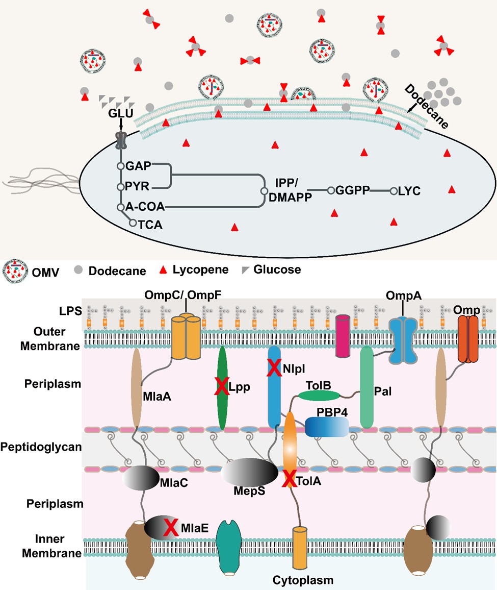 白仲虎教授团队针对番茄红素无法从生产底盘中分泌出来其生物合成经常受下游加工的严重阻碍,工程改造细胞膜通过细胞产外膜囊泡分泌疏水性化合物番茄红素以解决问题。为了提高番茄红素的释放率,开发了一种高通透性大肠杆菌菌株。首先,将来自谷氨酸棒杆菌的异源甲羟戊酸途径和crtEBI基因在大肠杆菌BL21(DE3)中过表达,用于番茄红素的合成。然后,为了确保原位番茄红素的分泌,删除了TolA-TolQ-TolR中的脂蛋白Lpp、脂蛋白NlpI、内膜渗透酶蛋白mlaE和膜锚定蛋白tolA,以改善膜通透性。最终,菌株LYC-8在补料分批发酵中产生了438.44±8.11mg/L和136.94±8.11mg/L的细胞外和细胞内番茄红素。分泌的外膜囊泡的扫描电镜分析、蛋白质组学和脂质组学分析都显示了外膜囊泡的生成。饱和脂肪酸、不饱和脂肪酸和环丙烷脂肪酸以及支链和酰基链长度的比例变化,显示改变了膜脂肪酸的组成。这些基因的组合缺失改变了细胞形态,确保了番茄红素原位释放的膜流动性和通透性。细胞在形状、大小和长度的结构和形态变化与细胞包膜的机械强度变化有关。本研究通过生产外膜囊泡提高膜通透性介导增强番茄红素生产和分泌,为亲脂性化合物的有效释放和下游加工建立了一个无细胞裂解系统,证明了细胞囊泡化提高膜通透性在有效生产番茄红素中的重要性。