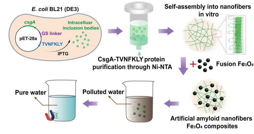 针对以上问题,张娟教授课题组利用淀粉样蛋白多官能团和自组装特性在重金属吸附中的优势,通过微生物合成大肠杆菌Curli卷曲纤维中最大的结构亚基CsgA蛋白,并与Fe3O4磁性纳米颗粒体外结合为CsgA-Fe3O4复合体,在水体低浓度重金属的去除中显示了优秀的性能。