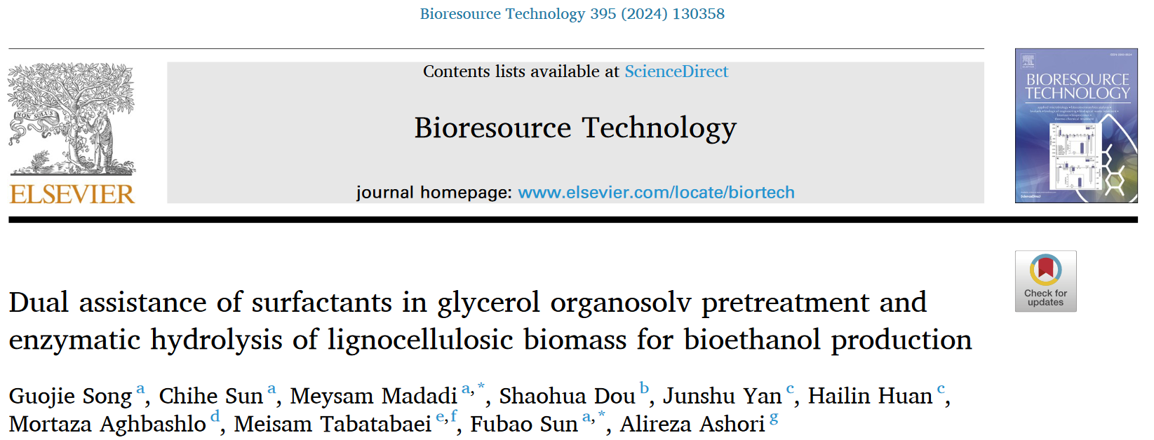 生物资源与生物炼制研究团队在木质纤维素生物质转化制燃料乙醇方面取得重要进展,并发表研究成果“Dual assistance of surfactants in glycerol organosolv pretreatment and enzymatic hydrolysis of lignocellulosic biomass for bioethanol production, 2024, 395: 130358 (一区, Top, IF 11.4)