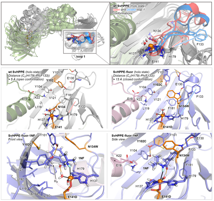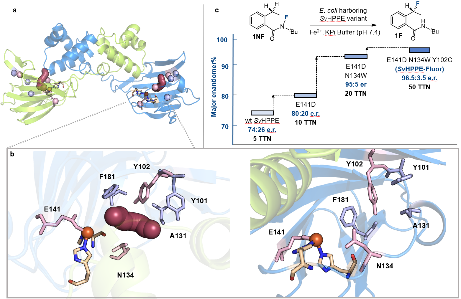在确认了初始活性后,作者通过定向进化逐步提高了SvHppE的催化性能。鉴于天然底物S-HPP与模型底物N-氟酰胺1NF之间存在较大的结构差异,作者首先构建了SvHppE的同源模型,并对“酶–底物”进行了分子动力学(MD)模拟。再结合隧道分析,作者确定了一些关键的氨基酸残基位点,包括Y101、Y102、A131、N134和F181,这些残基很可能会影响底物1NF在SvHppE中的结合和定位。与中心铁配位的临近氨基酸残基E141同上述五个氨基酸位点,一并作为点饱和突变(SSM)的对象。对E141进行点饱和突变和筛选后发现了E141D优势突变体,其催化活性比野生型明显上升:产率7.1%和对映体比例e.r = 80:20。以E141D突变体作为母体,在其他五个位点上进行了后续点饱和突变和筛选,得到了一个三重突变体SvHppE_N134W_E141D_Y102C(以下简称:SvHppE-Fluor),能够以TTN = 50、产率30%和对映比96.5:3.5的催化效率得到目标氟化产物(图3)。
