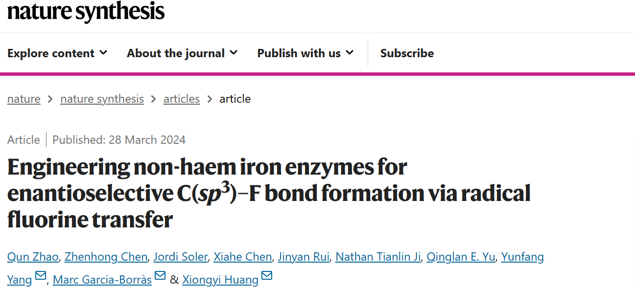 赵群教授和浙江工业大学杨云芳教授、赫罗纳大学Marc Garcia-Borràs教授、约翰霍普金斯大学Xiongyi Huang教授在金属酶催化新功能拓展方面取得重要进展,研究成果“Engineering non-haem iron enzymes for enantioselective C(sp3)–F bond formation via radical fluorine transfer”正式发表于《Nature Synthesis》杂志。