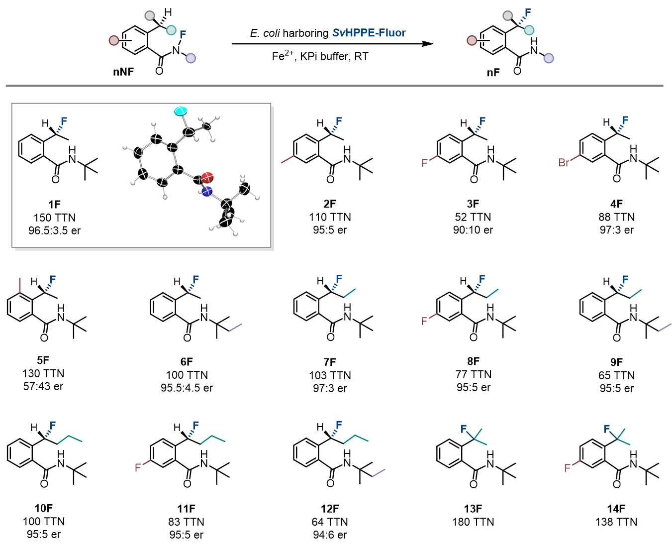 首先,作者以N-氟酰胺底物1NF作为模型底物,在全细胞条件下测试了40多种不同的非血红素铁酶,其中包括了前期开发叠氮化反应所积累SavHppD突变体库。通过测试发现了几种能够催化不对称氟转移反应的酶,最好的结果来自绿色链霉菌(Streptomyces viridochromogenes)的(S)-2-羟基丙磷酸酯环氧化酶(SvHppE),它以总转化数TTN = 5、产率3.8%以及e.r = 74:26的对映体比例生成了目标氟化产物。在不含SvHppE的空白对照实验中,仅能观察到痕量的氟化产物。此外,与催化中心铁配位的两个组氨酸被突变为丙氨酸,反应的产率和对映选择性显著降低,上述结果表明该转化过程是由金属铁中心催化完成。