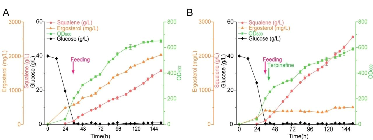 食品合成生物学与生物制造团队研究人员通过细胞区室化策略和脂质代谢工程在解脂酵母中高效生产角鲨烯(图1)。首先,以解脂亚洛酵母为出发菌株,筛选MVA途径限速酶,并对关键基因进行两轮多拷贝整合(图2)。接下来,筛选具有高靶向效率的过氧化物酶体信号肽,将角鲨烯合成途径引入过氧化物酶体,角鲨烯产量提高到1938.8 mg/L(图3)。然后,通过过表达POT1、POX1和ACL1,强化过氧化物酶体中β-氧化途径(图4)和胞质中乙酰辅酶A的供给(图5),角鲨烯产量进一步提高到2549.1 mg/L。最后,在5-L生物反应器中进行补料分批发酵,角鲨烯的产量达到51.2 g/L,葡萄糖收率60.5 mg/g,产率0.33 g/L/h。(图6)。这是目前报道的微生物合成角鲨烯的最高产量,这项工作也为微生物合成角鲨烯及其衍生物提供了重要的参考。