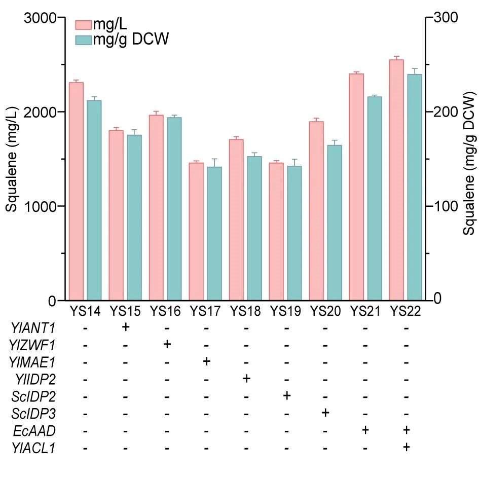 角鲨烯(Squalene)是一种高价值无环三萜化合物,常被用作抗氧化剂、抗肿瘤剂、疫苗佐剂等,广泛应用于食品、化妆品、医疗行业。角鲨烯可从鲨鱼肝油、橄榄、苋菜籽等动植物中分离获得,但由于动物保护法规以及植物中提取纯化的繁琐工艺,这类生产方式有很大的局限性。近年来,随着对基因编辑工具和代谢模型的不断挖掘,人们尝试在微生物中构建细胞工厂以持续、高效、安全的合成角鲨烯。然而,目前的研究中甲羟戊酸(MVA)途径碳通量不足、胞质中疏水性大分子储存空间有限、脂质合成和角鲨烯合成的竞争等因素限制角鲨烯在微生物中的高效合成。解脂酵母(Yarrowia lipolytica)是一种Crabtree阴性酵母,具有底物谱广、脂质含量丰富、适应高密度发酵等特点。解脂酵母的过氧化物酶体是利于角鲨烯储存的疏水性细胞区室,其中存在的β-氧化途径是产生乙酰辅酶A的重要代谢过程,因此,过氧化物酶体有潜力被开发为角鲨烯的“生产车间”。