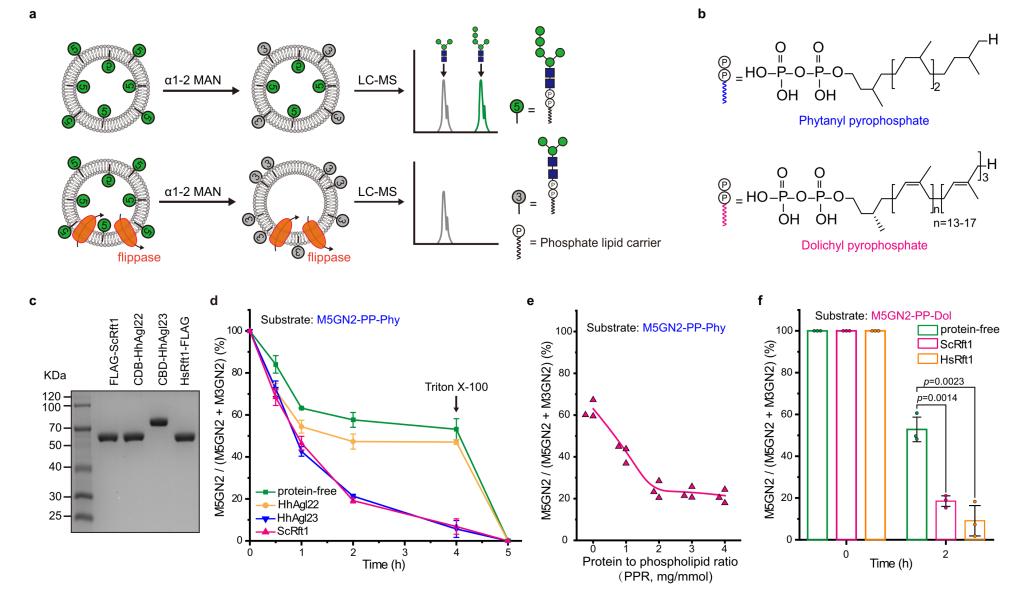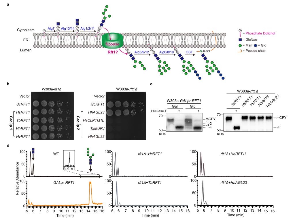 天冬酰胺 (N)-连接的糖基化是真核细胞蛋白质重要的翻译后修饰方式之一,约90%的糖蛋白被N-糖基化修饰。N-糖基化修饰始于内质网(ER)膜上多萜醇寡糖前体(DLO)的装配,首先在ER膜的外侧通过一系列特定的糖基转移酶(Alg)将2个N-乙酰葡萄糖胺(GN)和5个甘露糖(M)依次添加至多萜醇磷酸(Dol-P),形成M5GN2-PP-Dol。随后,M5GN2-PP-Dol通过磷脂双分子层翻转至ER内腔,这种跨膜转运是快速的、不依赖ATP、对蛋白酶敏感,并且具有极高的底物特异性。转运在热力学上是不利的,因为极性的糖基头部必须穿过脂双层的疏水内部。Helenius和Aebi在二十年前报道Rft1可能参与了该过程。然而,迄今为止,糖生物学界对Rft1翻转酶的身份仍存在很大争议。作者通过高拷贝抑制子筛选到了古菌HhAgl23可以回补rft1Δ细胞的致死性状和N-糖基化缺陷。此外,作者还开发了一个体外LLO翻转酶测定法,利用蛋白脂质体和纯化的Rft1或HhAgl23蛋白中确认了M5GN2-PP-Dol的翻转活性。最终确认Rft1翻转M5GN2-PP-Dol的功能。