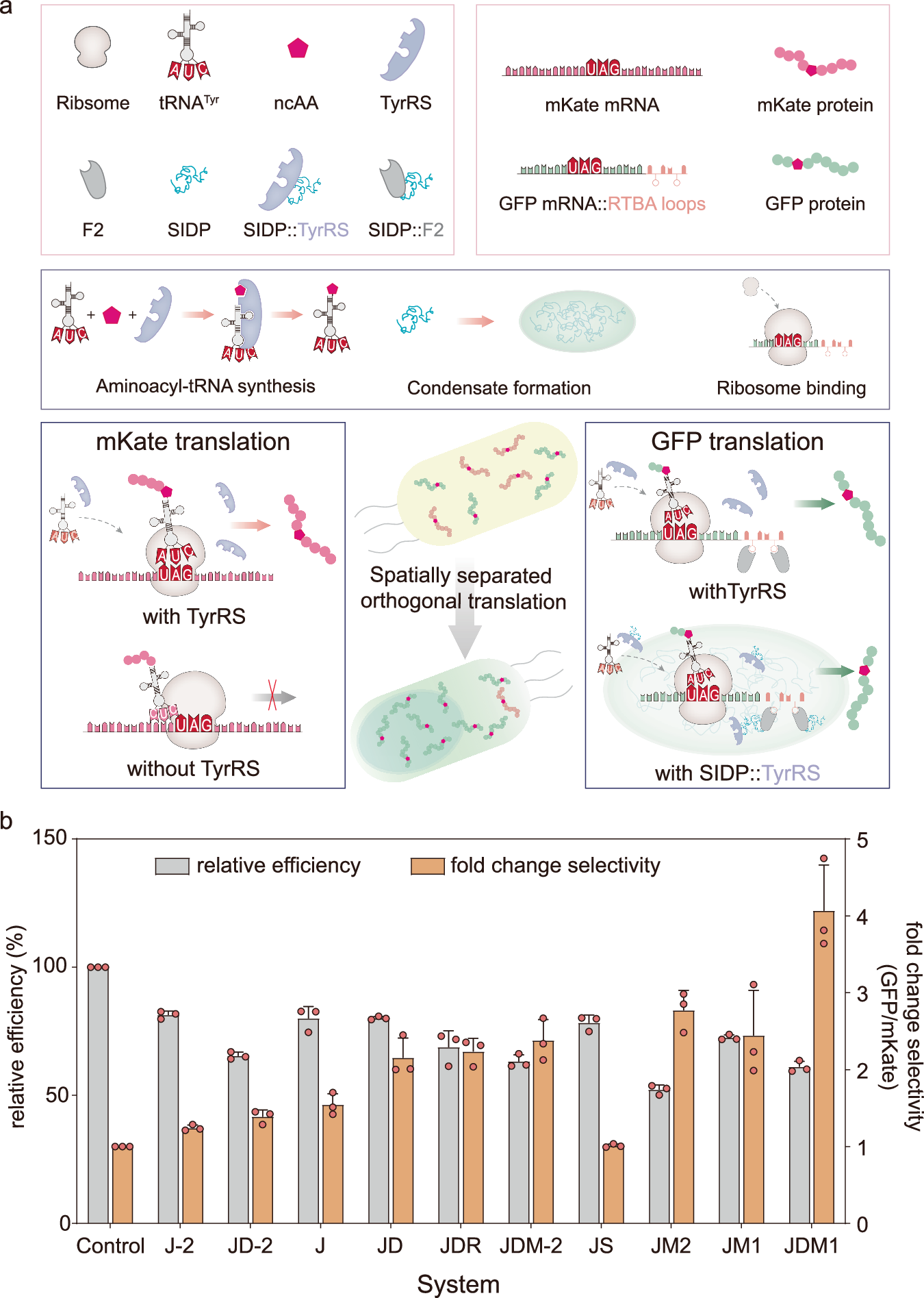 在上述研究基础上,构建脱氧紫色杆菌素合成底盘细胞,通过细胞的颜色变化,可视化证明了人工无膜细胞器的代谢网络调控能力(图3)。与此同时,结合遗传密码扩展与核酸适配体模块,创制空间分离的正交翻译系统,将人工无膜细胞器作为mRNA的特定翻译场所,从而实现目的基因的选择性翻译。适配优化不同模块后,目的基因的翻译选择性达到4.0倍(图4)。