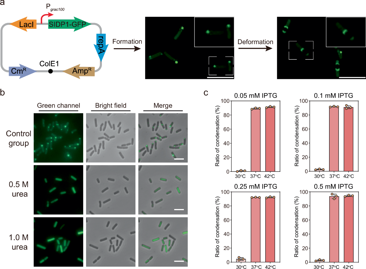 无膜细胞器是无序蛋白或核酸等生物分子经液-液相分离(LLPS)所形成的亚细胞区室结构,其在信号传导、生化过程调控等方面具有重要功能。与膜包被细胞器或细菌微区室相比,无膜细胞器具有良好的液态流动性和小分子自由渗透性。因此,利用天然无序蛋白或RNA在微生物细胞工厂中构建人工无膜细胞器已成为当前的研究热点。然而,从头设计可编程无膜细胞器,正交调控原核微生物细胞工厂中的代谢网络或蛋白翻译过程仍然是一项挑战。