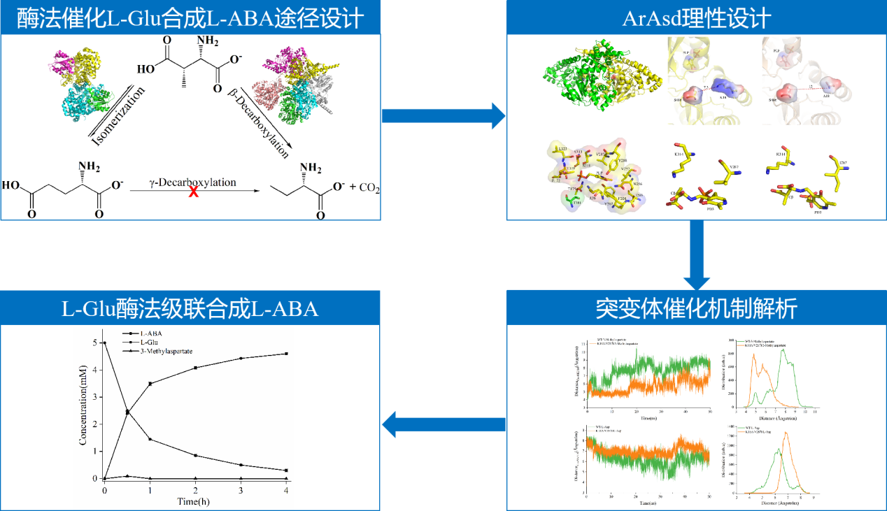 为实现L-Glu中γ位羧基的去除,本研究提出利用谷氨酸变位酶(glutamate mutase,GM)和天冬氨酸β-脱羧酶(L-aspartate-β-decarboxylase,Asd)级联催化L-Glu合成L-ABA的新途径:GM首先将L-Glu转化为L-3-甲基-天冬氨酸(L-3-Met-Asp),再由Asd通过β-脱羧生成L-ABA。虽然GM可以将L-Glu转化成L-3-Met-Asp,然而由于Asd严格的底物选择性特点,无法转化L-3-Met-Asp生成L-ABA。课题组以一种高活性Asd为原始酶,经同源建模及结构分析,首先对底物通道进行改造,获取对L-3-Met-Asp具有催化能力的突变体K18A;在此基础上对催化口袋改造,获得了催化活力进一步提升的突变体K18A/V287I。最终,利用GM与Asd的突变体K18A/V287I级联催化,成功实现将L-Glu转化为L-ABA,转化率达到98.9%。本研究不仅建立了从L-Glu到L-ABA的酶法合成的新途径,展现了巨大的应用前景,并且结合催化口袋及底物通道改造拓展酶的底物谱,该策略非天然氨基酸生物制备途径的开发提供了新的思路。