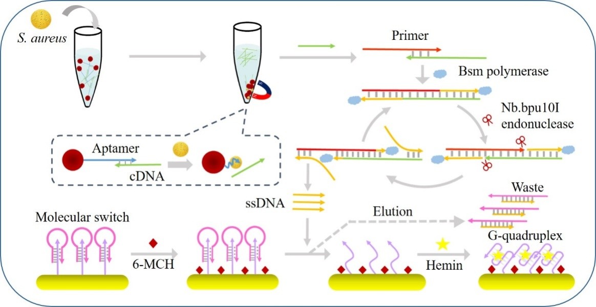 周楠迪教授团队利用非常规核酸结构三螺旋DNA具有的高度灵活性以及包含更多核酸链这一特性,通过结合链置换扩增技术,构建了基于三螺旋分子开关的金黄色葡萄球菌生物传感器。首先,利用磁珠分离体系,对溶液中的金黄色葡萄球菌进行识别。磁珠表面修饰部分互补双链Apt-cDNA,靶标与适配体结合后,置换下的cDNA通过磁性分离技术收集。随后在引物,聚合酶和切刻酶的作用下,触发链置换扩增反应,实现目标单链DNA的扩增。与此同时,在电极表面修饰事先合成的三螺旋DNA分子开关,由于三螺旋DNA结构的稳定存在,溶液中显示低电流信号。将链置换扩增产物加入电极反应体系,扩增单链DNA与三螺旋DNA的帽子区域互补,打开分子开关。电极表面剩余的富G序列形成G-四链体结构,与氯化血红素结合形成电活性复合物,产生显著的电化学信号。该生物传感器可检测30-3×108 CFU/mL动态范围内的金黄色葡萄球菌,检测限低至8 CFU/mL。同时,通过更换识别适配体和引物,该传感器可应用与其他微生物的检测,具有一定的通用性。本研究为食品和环境中多种有害微生物的检测提供了一种替代方法,具有良好的应用前景。