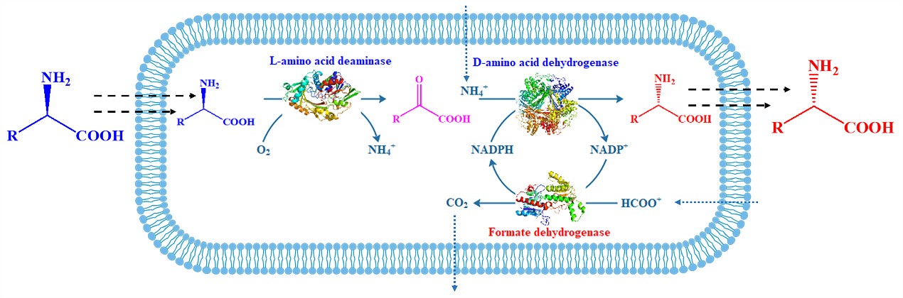 D-氨基酸作为有机合成中的手性助剂和手性合成砌块,在医药和精细化学品合成中具有重要作用。当前, D-氨基酸的合成方法主要包括化学法和生物酶法,化学法主要存在成本高、收率低、选择性低和试剂毒性等缺点,而生物酶法通常需要特殊或昂贵且非商业化的底物来进行D-氨基酸的合成。因此,如何利用廉价易得的底物高效合成D-氨基酸及衍生物是实现大宗氨基酸高值化和高效合成D-氨基酸的主要问题。
