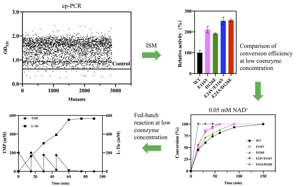 穆晓清团队在对亮氨酸脱氢酶的定向进化中使用了两种筛选策略。首先通过易错PCR寻找对亮氨酸脱氢酶催化效率有提升作用的关键残基,通过约3000株突变体筛选锁定了3个对催化效率起作用的关键点;然后在对三个关键点进行组合的过程中,运用了低辅酶浓度的筛选策略对迭代饱和突变文库进行了筛选,并获得了在低辅酶浓度条件下依然展现出高催化效率的突变组合。通过两步筛选,最终获得的突变组合E24V/E116V对底物和辅酶的亲和力分别提高了7.7倍和2.8倍,同时该突变株对底物的催化效率kcat/Km提高了5.4倍。在配合葡萄糖脱氢酶辅酶再生系统的反应体系中,该突变体在低辅酶浓度的条件下展现出较高的催化效率。当辅酶浓度为0.05 mM时,E24V/E116V的催化效率相比于野生型提高了10倍。在高浓度底物的转化实验中,存在显著的底物抑制现象。为了解除底物抑制的影响,本研究采取了分批补料的策略,在75分钟内实现了0.57 M底物完全转化。最终达到了22.8 mmol·h−1·L−1·g−1的比时空转化率,TTN高达11400。