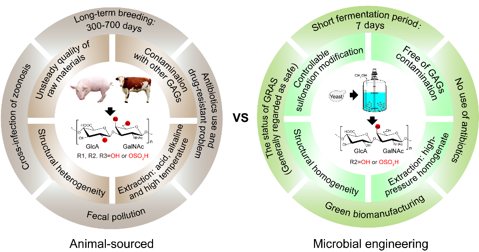硫酸软骨素(Chondroitin sulfate, CS)是一种广泛分布在软骨组织中的线性糖胺聚糖,由葡萄糖醛酸(GlcA)和N-乙酰半乳糖胺(GalNAc)通过β(1→3)和β(1→4)糖苷键交替连接并经过一定磺酸化修饰而成。CS广泛应用于临床、医疗和营养保健等领域。然而,当前所有商业化的CS都是来自动物组织提取,这种生产模式存在许多问题,例如动物饲养周长、抗生素的使用、动物排泄物的污染、使用高温及酸碱提取以及产品存在潜在的致病因子等。