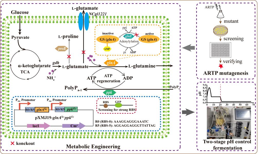 饶志明教授团队针对上述发酵法生产L-谷氨酰胺过程中存在的产量低、转化率低及工艺不成熟等问题,以谷氨酸棒杆菌为出发菌株,采用代谢工程改造结合两阶段pH调控策略高效制备L-谷氨酰胺。首先,通过ARTP诱变及高通量筛选获得了一株产量为25.7±2.7 g/L的谷氨酸棒杆菌N01。接着,以N01为出发菌株进行一系列的理性代谢工程改造,主要包括:(1)增强前体L-谷氨酸富集池及流向L-谷氨酰胺的碳通量。敲除proB基因,阻断脯氨酸支路竞争途径;敲除谷氨酸机械分泌通道蛋白NCgl1221,降低发酵液中副产物L-谷氨酸含量,同时使更多的前体L-谷氨酸在胞内积累从而促进L-谷氨酰胺的高效合成。(2)提高关键酶谷氨酰胺合成酶(GS)的催化活性。敲除谷氨酰胺合成酶腺苷酰化转移酶GlnE,解除GS的腺苷酰化作用;通过筛选8种不同来源的GS酶,获得了一种酿酒酵母来源的具有高催化活性的GS,并用质粒pXMJ19进行异源过表达。(3)通过引入基于PPK的ATP再生系统增强胞内ATP供应。串联表达大肠杆菌来源的多聚磷酸盐激酶ppk,增强胞内ATP再生。(4)利用RBS工程优化串联质粒pXMJ19-glnA-ppk基因表达水平。最后,为解决菌体生长和发酵产酸之间的不平衡,提出了pH分阶段调控策略并优化了pH,从而实现了L-谷氨酰胺产量的大幅度增长。最终的工程菌在5L发酵罐中L-谷氨酰胺的最高产量为73.5±3.1 g/L,糖胺转化率为0.368±0.034 g/g葡萄糖。本研究为已报道的利用谷氨酸棒杆菌生产L-谷氨酰胺的最高产量,为工业生产L-谷氨酰胺及相关的高价值产品提供了一系列有效的策略。