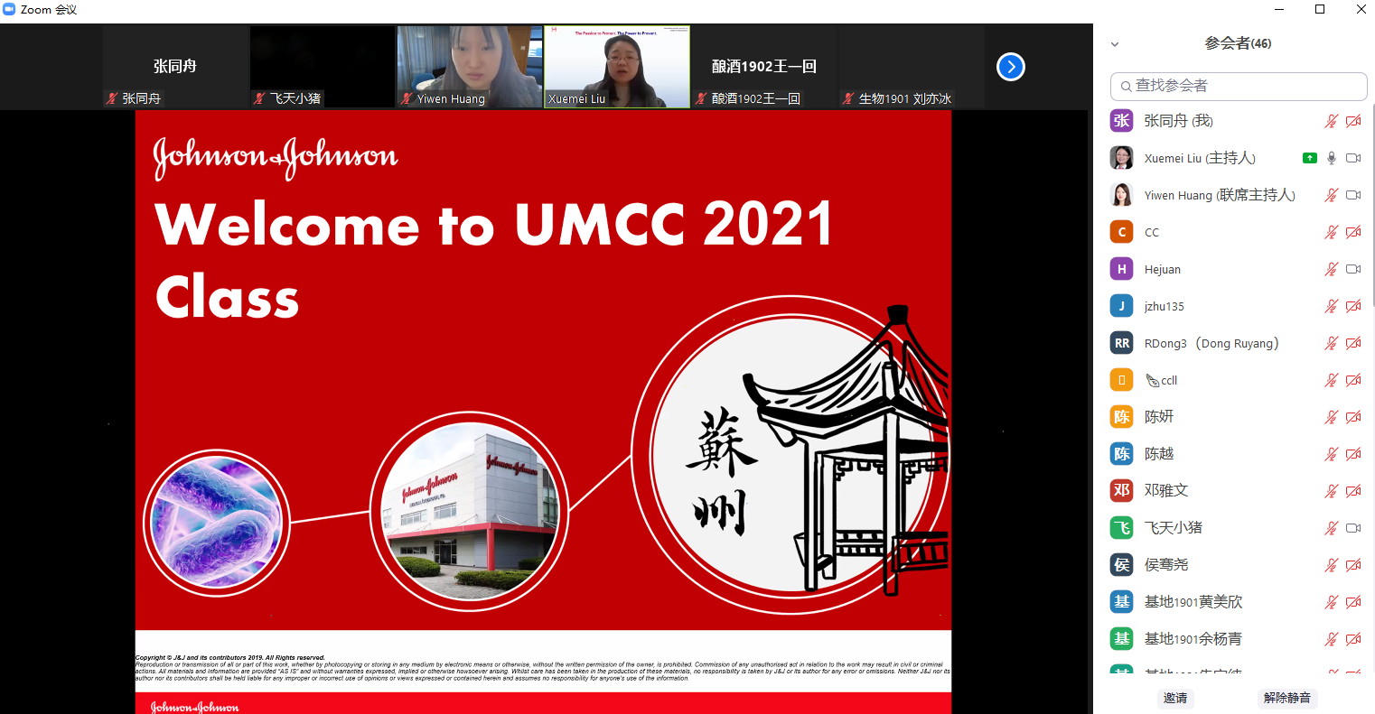 与强生(苏州)医疗器材有限公司2021年度校企合作课程(医疗器械和制药微生物学UMCC模块)开班并进行第一次授课。强生(苏州)公司微生物质量及无菌保证(MQSA)总监刘雪美、MQSA高级研究员黄奕雯、MQSA经理朱健杰、MQSA研究员董薷阳,h动画