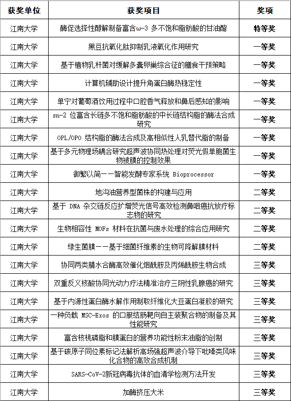 近日,全国大学生生命科学竞赛(2022,创新创业类)公布结果,我校生物工程、食品、化学与材料工程、生命科学与健康工程、医学五个学院共40个学生项目参赛,共获得特等奖1项,一等奖8项,二等奖4项,三等奖8项。我校获得优秀组织奖。