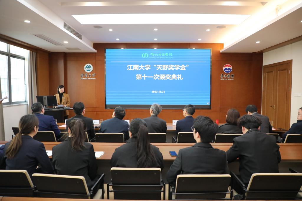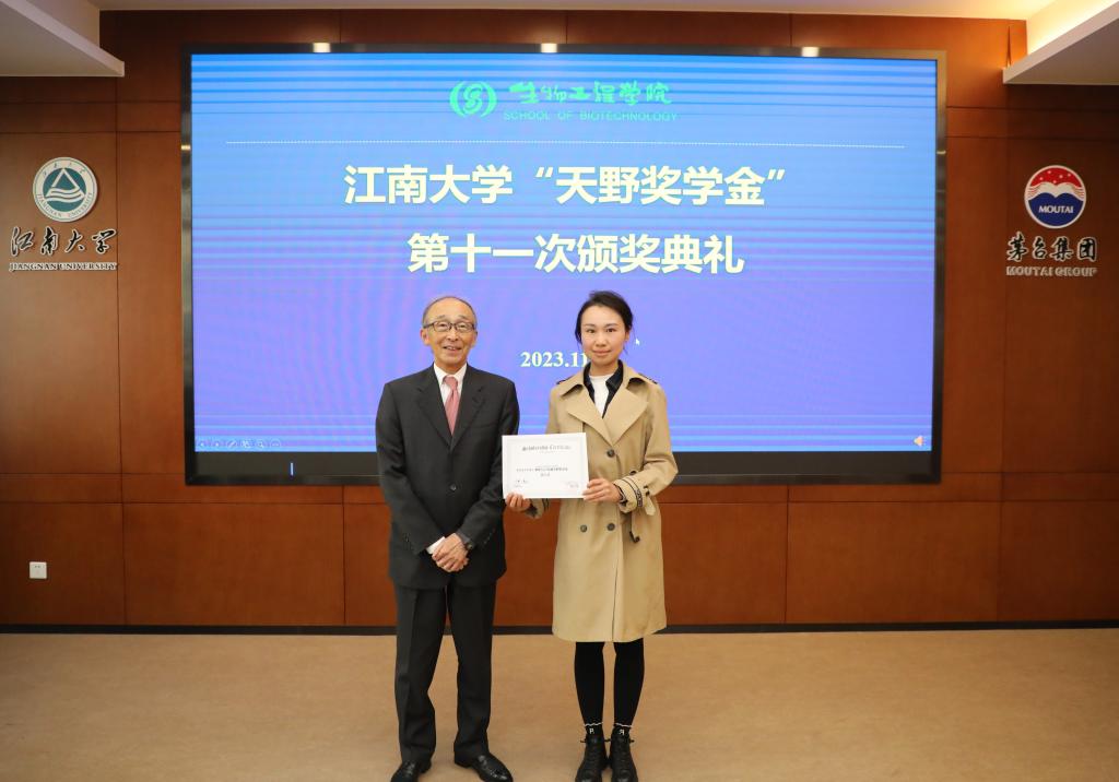 程捷音宣读获奖名单。赵英汉、张长太、李洋等19名同学分获本次“天野奖学金”一、二、三等奖,细胞培养肉团队获评团队奖。颁奖仪式上,陈坚、小林俊一、刘龙分别为一、二、三等奖获得者颁奖,天野源之为团队奖颁奖。学院2021级硕士赵英汉作为获奖学生代表发言。他回顾了自己在食品合成生物学与生物制造团队的学习科研经历,并对天野酶制品株式会社的资助和h动画