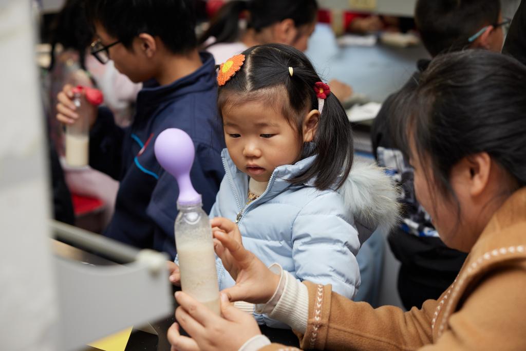 实验教学平台、食品发酵国家级实验教学示范中心,生工2101团支部同学为小朋友们精心设计了“洋葱表皮细胞质壁分离”和“酵母吹气球”两个实验。“质壁分离”实验中,在显微镜下观察到滴加蔗糖溶液的洋葱紫色的原生质体从与细胞壁紧密贴合,再与细胞壁分离开并逐渐变小,颜色逐渐加深。而在“酵母吹气球”实验中,气球在酵母的“努力”下逐渐膨胀变大。两个小实验充分激起了小朋友们对微观生物世界的兴趣,感受到生命科学的奇妙。