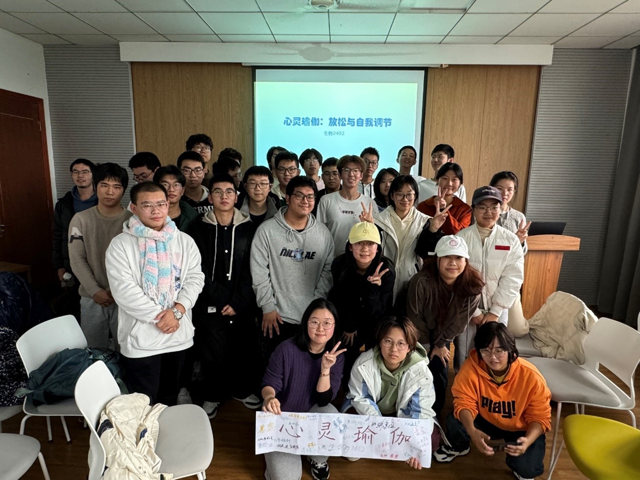 敞开心扉,释放真我,舒缓心理压力,生物2402班全体同学共同参与了心理瑜伽活动。社会实践科学研究表明,大学生的焦虑度日渐提升,而本次心理班会通过“大风吹”“撕掉烦恼”“书写憧憬”等趣味活动,拉近了班内同学间的距离,在充实积极的大学生活中开辟了一小段独属于我们的惬意时光。一个多小时的活动很短,但心灵的激荡很久,属于我们的故事还很长,精彩的镜头被记录,难忘的情节被书写,化作相片、文章,保留那片时光剪影,激励我们摆正心态,继续向前!