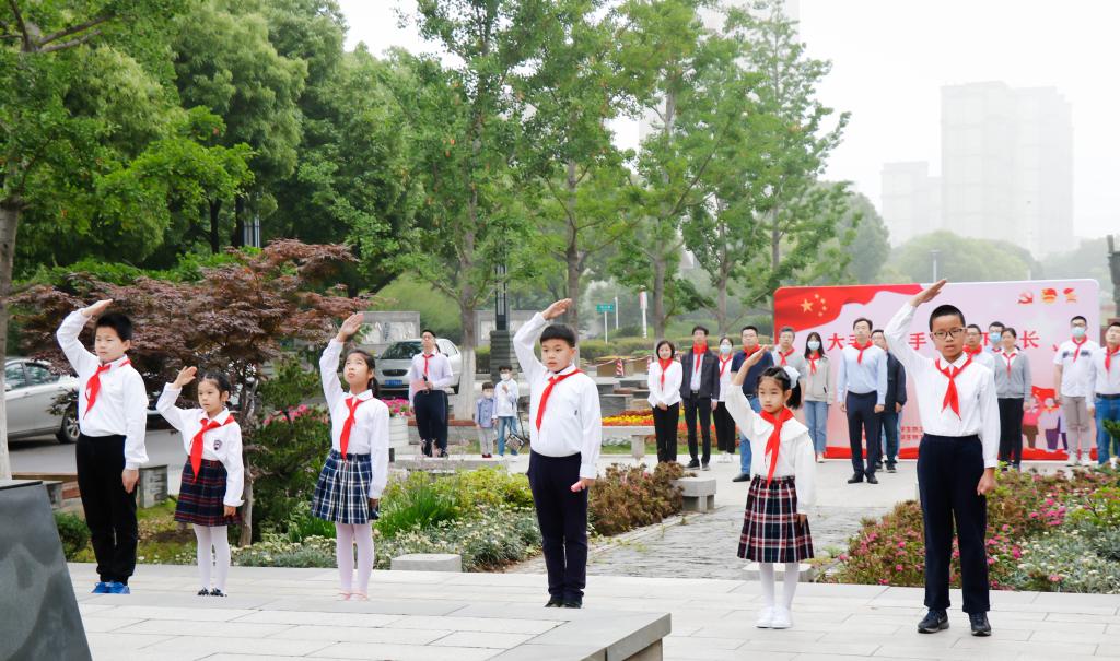 清晨7点活动正式开始,首先,来自省锡中实验学校第二小学的刘融、育英融创小学的鲍吴烨和唐楚奕,无锡惠山金桥实验学校的聂泽熙、无锡育红小学的马秉义以及锡师附小新城小学的钮崇梽等六位小学生为嘉宾敬献红领巾,并与h动画