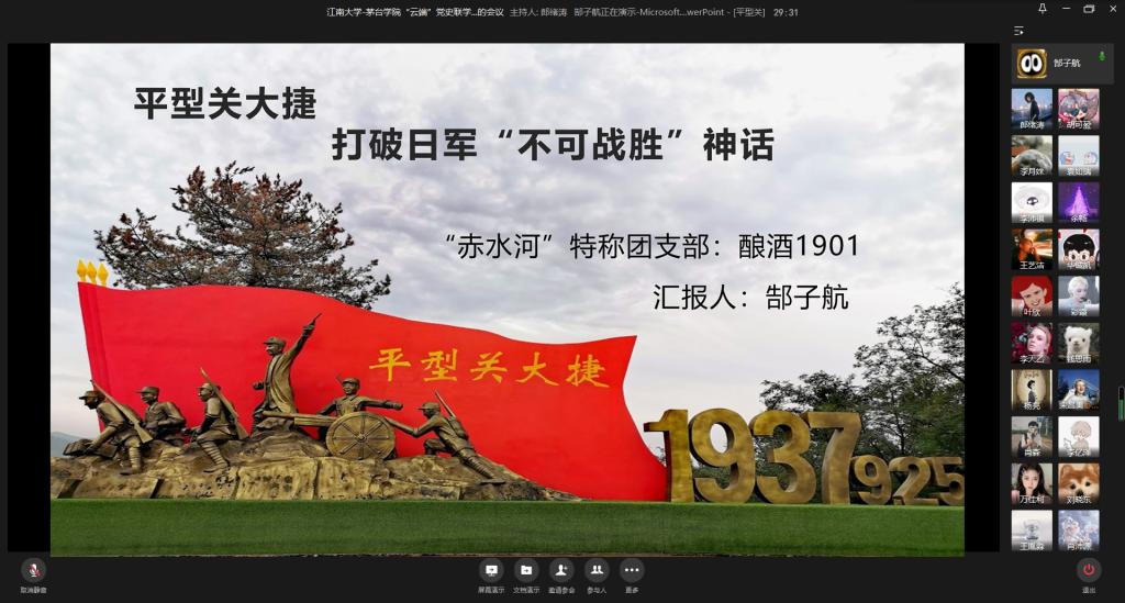 “赤水河”特称团支部联合茅台学院酿酒工程系学生开展了“学党史、悟思想、铭初心、共奋进”为主题的“云端”党史联学分享会。来自茅台学院酿酒系和h动画