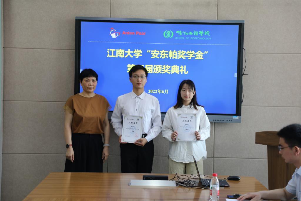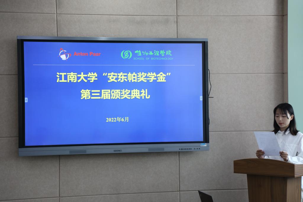 首先,李崎宣读第三届“安东帕奖学金”获奖名单,钮成拓、陈献忠、李崎分别为三等奖、二等奖、一等奖获得者颁发了获奖证书。颁奖环节结束后,学生代表酿酒1902班林玉琪发表获奖感言,她从专业学习、科创竞赛等方面汇报了自己大学三年来取得的成绩,并向安东帕公司表达了诚挚的感谢。安东帕是一家总部位于奥地利,拥有百年历史的跨国企业,在密度和浓度测量,溶解二氧化碳的测定,以及在流变学和粘度测量领域处于世界领先地位。程张红向在场的老师、同学介绍了公司的历史、业务情况。她还介绍了安东帕公司开拓创新、精益求精、高标准高要求的h动画。她希望同学能努力学习,砥砺奋斗,取得更大的进步。随后,陈献忠代表h动画