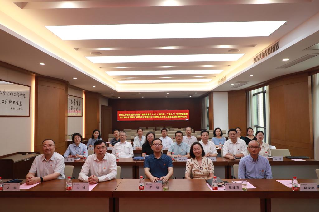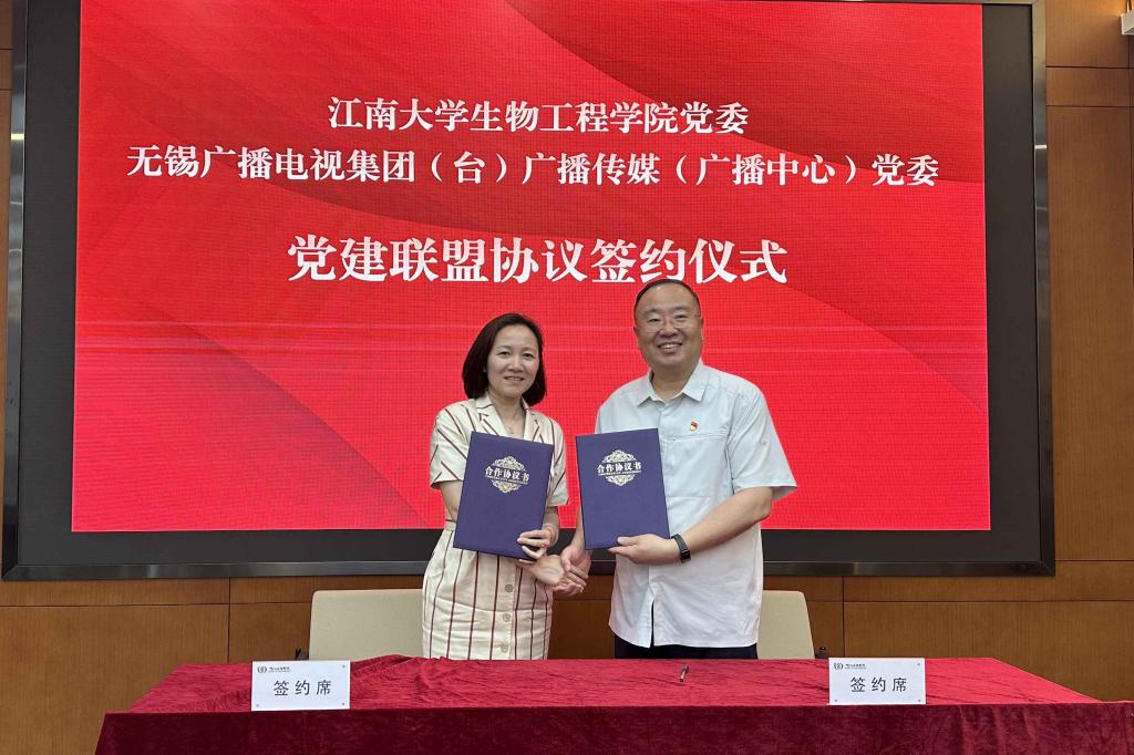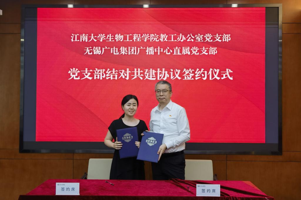 举行。生工学院党委书记程捷音和无锡广电广播传媒(广播中心)党委书记方益签署了党建联盟协议,生工学院教工办公室党支部与广播中心直属党支部签订了结对共建协议。院长刘龙和广电集团(台)党委委员、副总裁(副台长)王晓共同出席签约仪式。