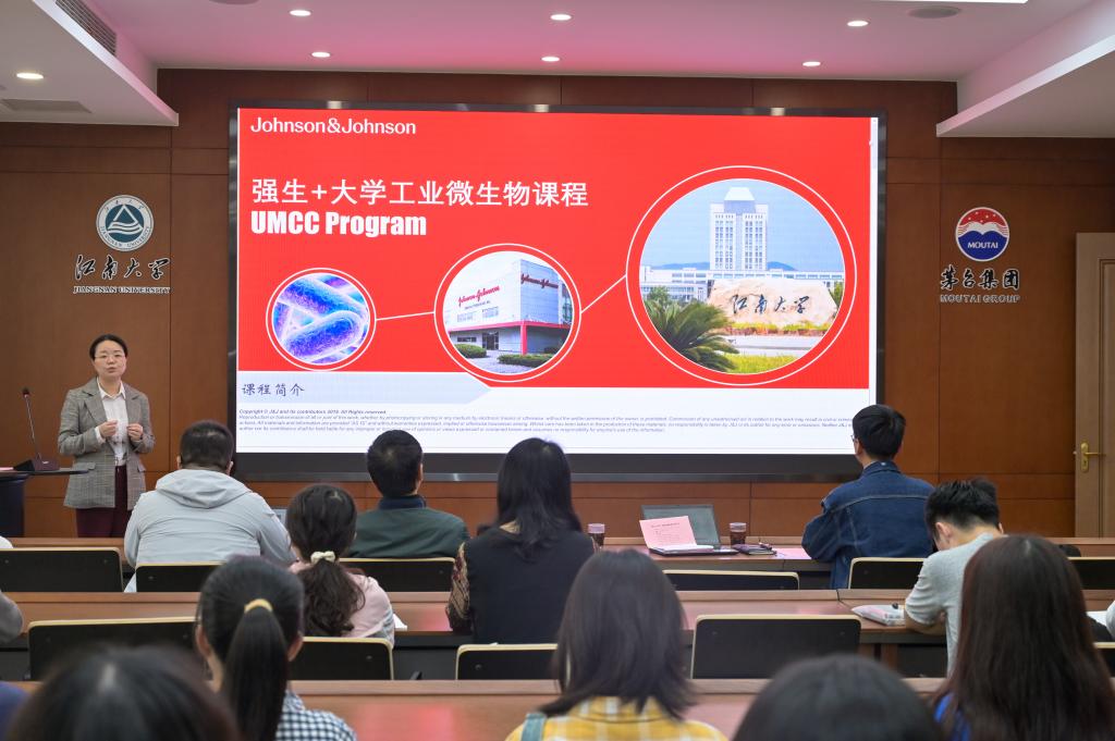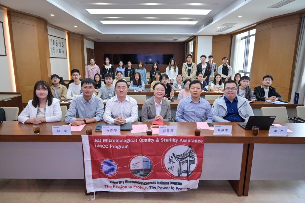 与强生(苏州)医疗器材有限公司2023年度校企合作课程(医疗器械和制药微生物学UMCC模块)在生工学院茅台厅正式开班。强生(苏州)公司微生物质量及无菌保证(MQSA)总监刘雪美、MQSA经理马春华,MQSA主任研究员秦杰、MQSA研究员胡瑜,h动画