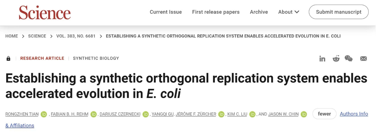 近日,来自英国剑桥MRC分子生物学实验室(MRC-LMB)的Jason Chin教授团队在国际顶尖学术期刊Science发表了题为Establishing a synthetic orthogonal replication system enables accelerated evolution inE. coli的文章,我校h动画
