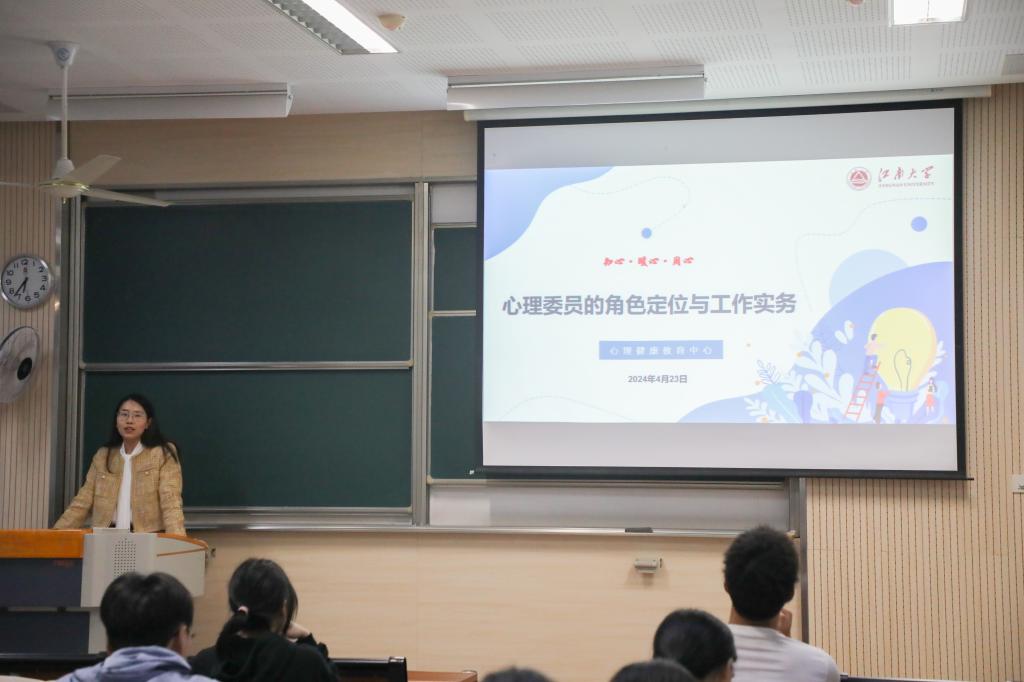 潘焱毓就全院心理委员做工作培训。她重点从心理委员岗位要求、基本素养、工作原则、工作内容以及现阶段学生常见的心理问题和心理危机的表现、学校心理安全网格化管理方案进行了梳理与培训。她指出,心理委员要发挥好师生之间的桥梁作用,成为同学们的知心朋友和心理健康的守护者。