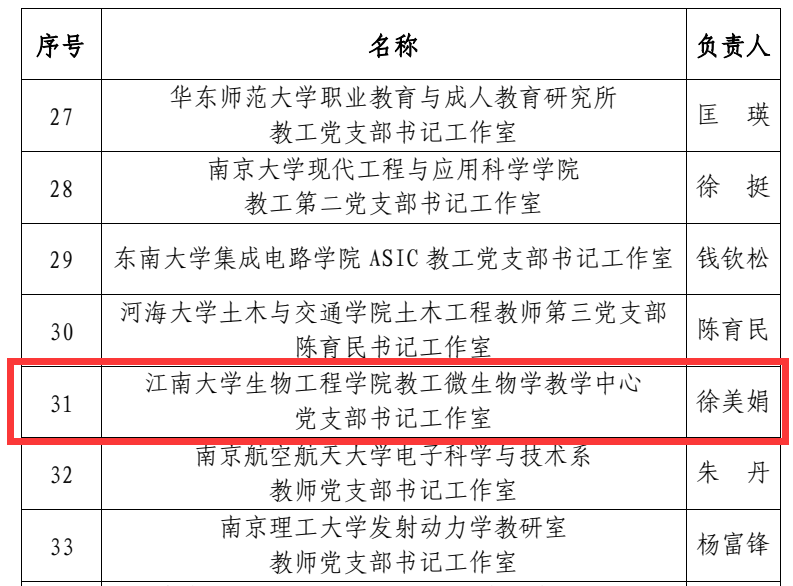 近日,教育部公布第三批高校“双带头人”教师党支部书记工作室遴选结果,我院徐美娟教授领衔的教工微生物学教学中心党支部书记工作室成功入选,这是我院党建工作方面取得的又一项突破。