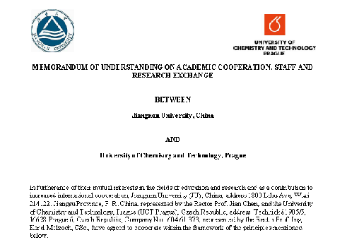 与捷克布拉格化工大学通过互访就双方共同感兴趣的合作点进行了多轮次的研讨。近期,两校正式签署校际合作协议,旨在建立两校之间的长期友好合作关系,推进并加快落实校际合作办学机构或项目的设立,并在生物工程类研究生的联合培养、博士双学位授予以及科学研究等方面进行深度合作。协议的签订与实施将进一步助推我校轻工技术与工程学科国际影响力的提升。