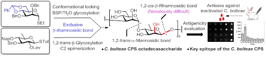 尹健教授致力于通过化学合成驱动高免疫活性糖类物质的发现与应用,已完成多种重要人类致病菌糖类抗原的全合成和免疫活性研究(Angew. Chem. Int. Ed., 2020, 59,13362; J. Am. Chem. Soc., 2018, 140: 3120; Chem. Commun., 2020, 56: 344; Chem. Eur. J., 2018, 24: 2868; Front. Chem., 2020, 8: 258)。在开展复杂寡/多糖全合成的过程中,团队着力发展糖链合成新策略,有效提高了各糖类抗原的制备效率。立体选择性一直是通过糖基化反应制备寡/多糖过程中的重要任务,也是评价一个糖基化反应整体效率的关键指标。在自然界聚糖结构中存在的各种糖苷键类型中,以β-甘露糖和β-鼠李糖为代表的1,2-顺式-β-糖苷键的选择性生成一直是糖化学的难点。自闭症相关鲍氏梭菌的荚膜十八糖便含有大量1,2-顺式-β-糖苷键,尹健教授团队通过模块化组装策略实现了该多糖结构中1,2-顺式-β-糖苷键立体专一性合成。基于多糖的二糖片段开展了1,2-顺式-β-糖苷键的合成方法优选,首先以4,6-O-苄叉基进行糖基供体构象锁定,通过预活化糖基化方法与糖基受体反应,立体专一性制得1,2-顺式-β-二糖。通过无构象锁定糖基供体的比较实验,发现4,6-O-苄叉基的糖基供体构象锁定效应在立体选择性糖基化中发挥关键作用。此外,利用β-葡萄糖基化-2号位构型翻转策略,可在无构象锁定效应作用下,完成1,2-顺式-β-二糖的立体专一性制备,并通过模块化组装策略成功制备了四糖至完整十八糖。经动物免疫获得鲍氏梭菌抗血清,糖芯片分析表明四糖是重要抗原表位,为鲍氏梭菌荚膜多糖免疫表位探究和糖缀合物疫苗的开发提供了理论基础。
