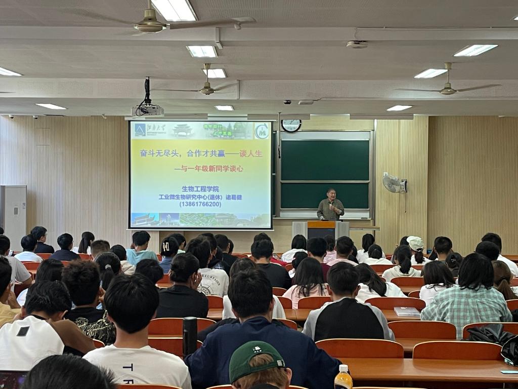 关工委特邀报告员、博士生导师诸葛健老师作《奋斗无尽头,合作才共赢》主题报告。学院党委副书记、副院长林丹,学院分团委书记兼学工办主任周春江,全体2023级本科新生以及茅台班新生全程参与。讲座由辅导员周杰主持。